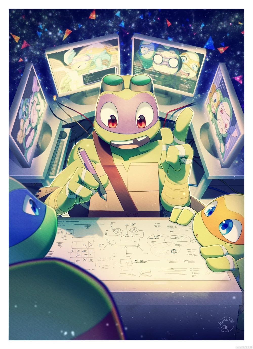 Ninja Turtles, specifically focusing on Donatello. He is depicted in his signature
