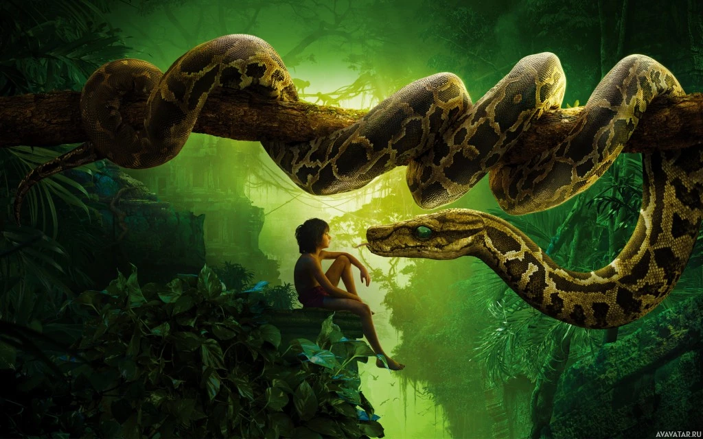 large snake wraps around both the child and the adult, creating a scene that could be from a movie or storybook. The setting appears to be a jungle or forest, with