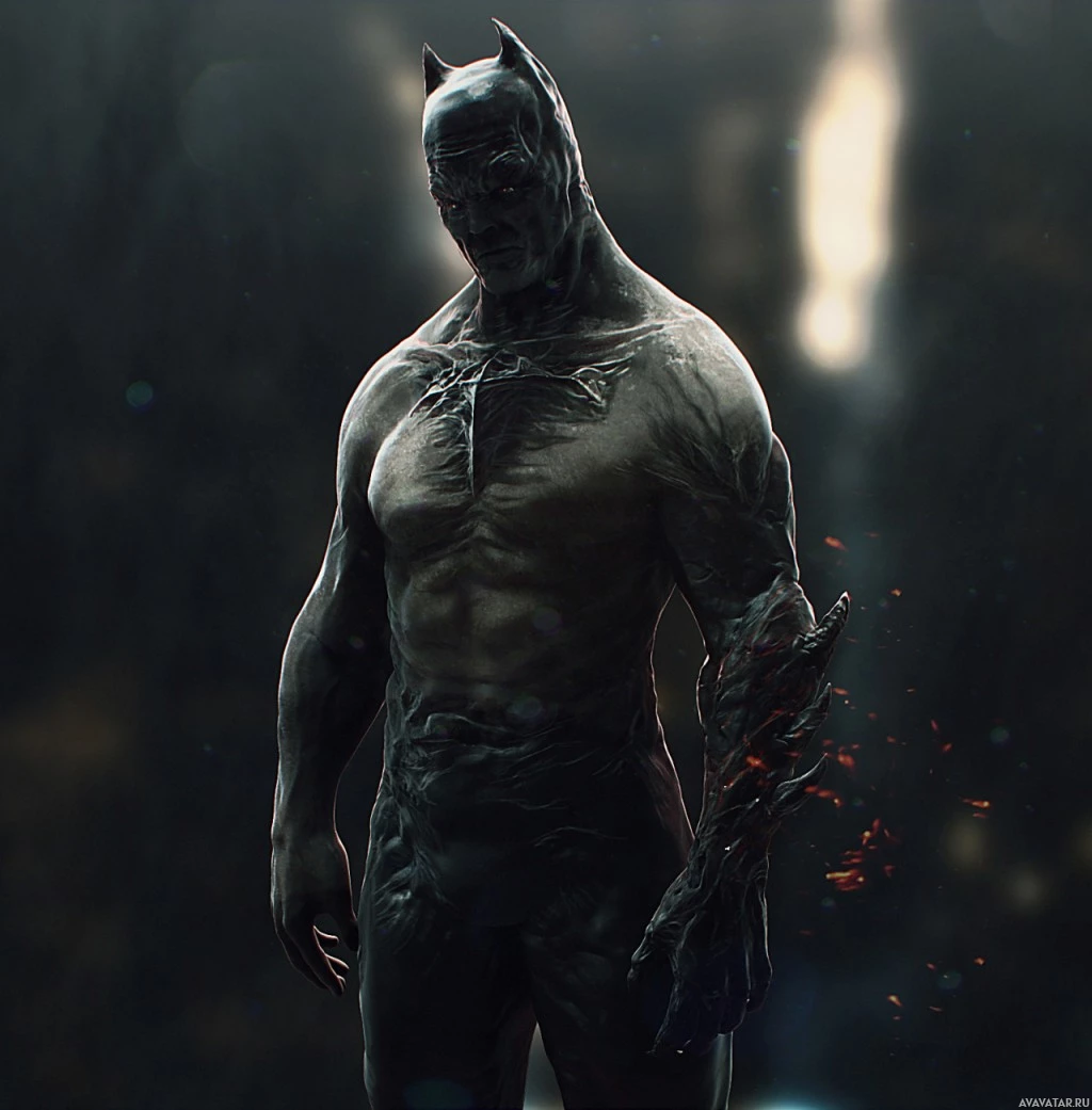 The image depicts a character that appears to be Batman. He is standing in a dark,