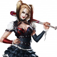 Harley Quinn, a popular comic book villainess known for her distinctive appearance. She's depicted in a dynamic pose, wielding her iconic baseball bat and wearing the recognizable black and red outfit with