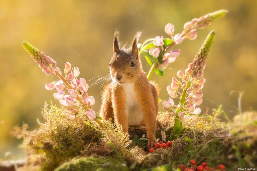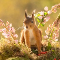 a small rodent, which appears to be an animal often referred to as a squirrel. It is perched on a pile of what looks like moss or dried foliage, surrounded by plants that have small