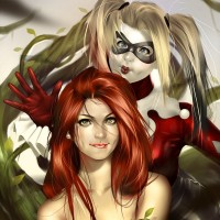 blonde hair with red and black highlights; and Poison Ivy, known for wearing green leaves as clothing or accessories and having green plant-like features. They are depicted in a close and intimate pose, suggesting