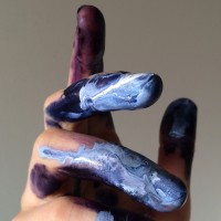 blue paint smeared on them, indicating that someone has been engaged in a painting activity, likely involving