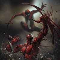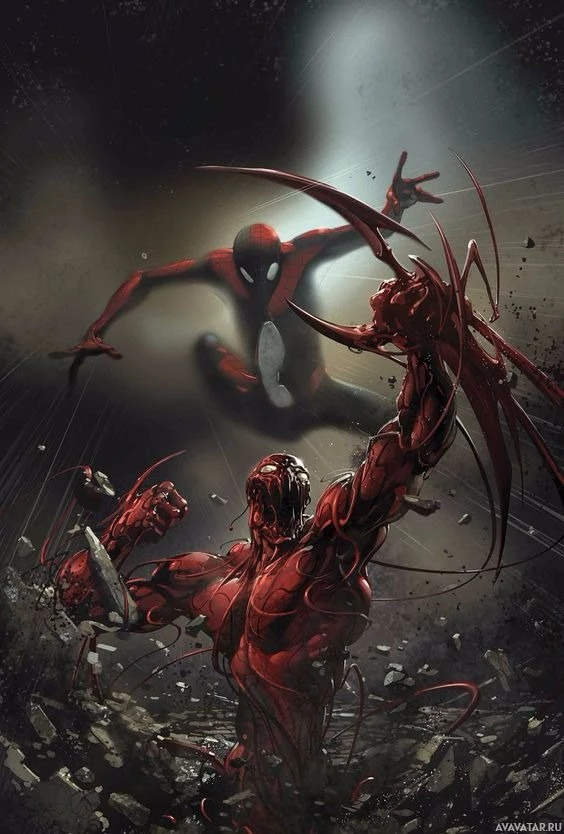 The image features two characters in a fight. On the left, there is Spider-Man, who is swinging his web to attack Carnage on the right. Carnage is responding with