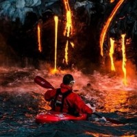 ocean water. Behind the individual, there is volcanic activity with lava flowing into the sea, creating