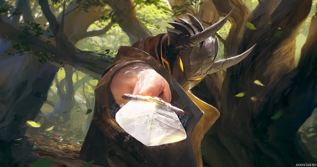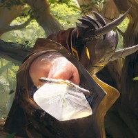 scene with a warrior or hero. The character is wearing armor and holding a sword, suggesting they are ready for battle. They are standing in what appears to be a forest or