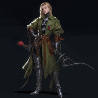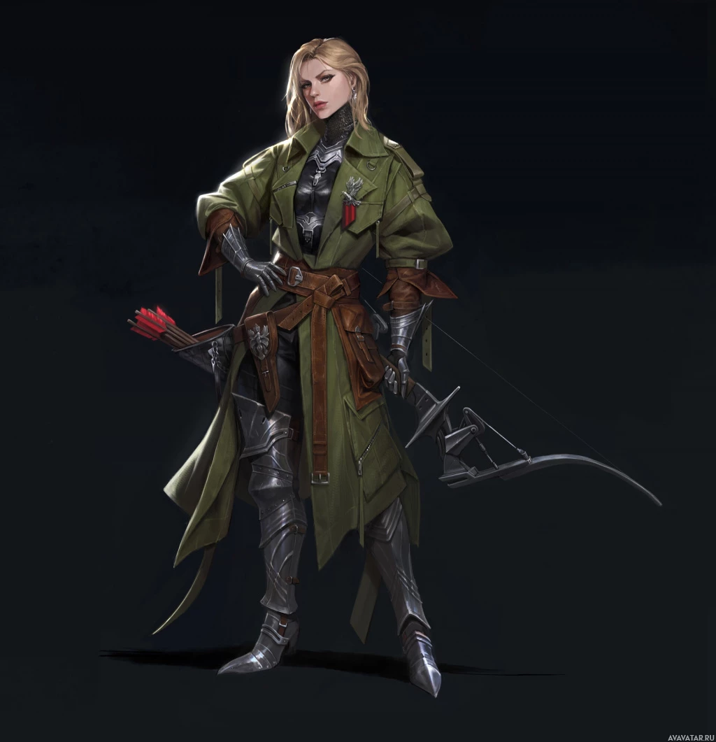 a female warrior or ranger, with blonde hair and wearing medieval-style armor. In her hands, she holds a longbow, which is a type of