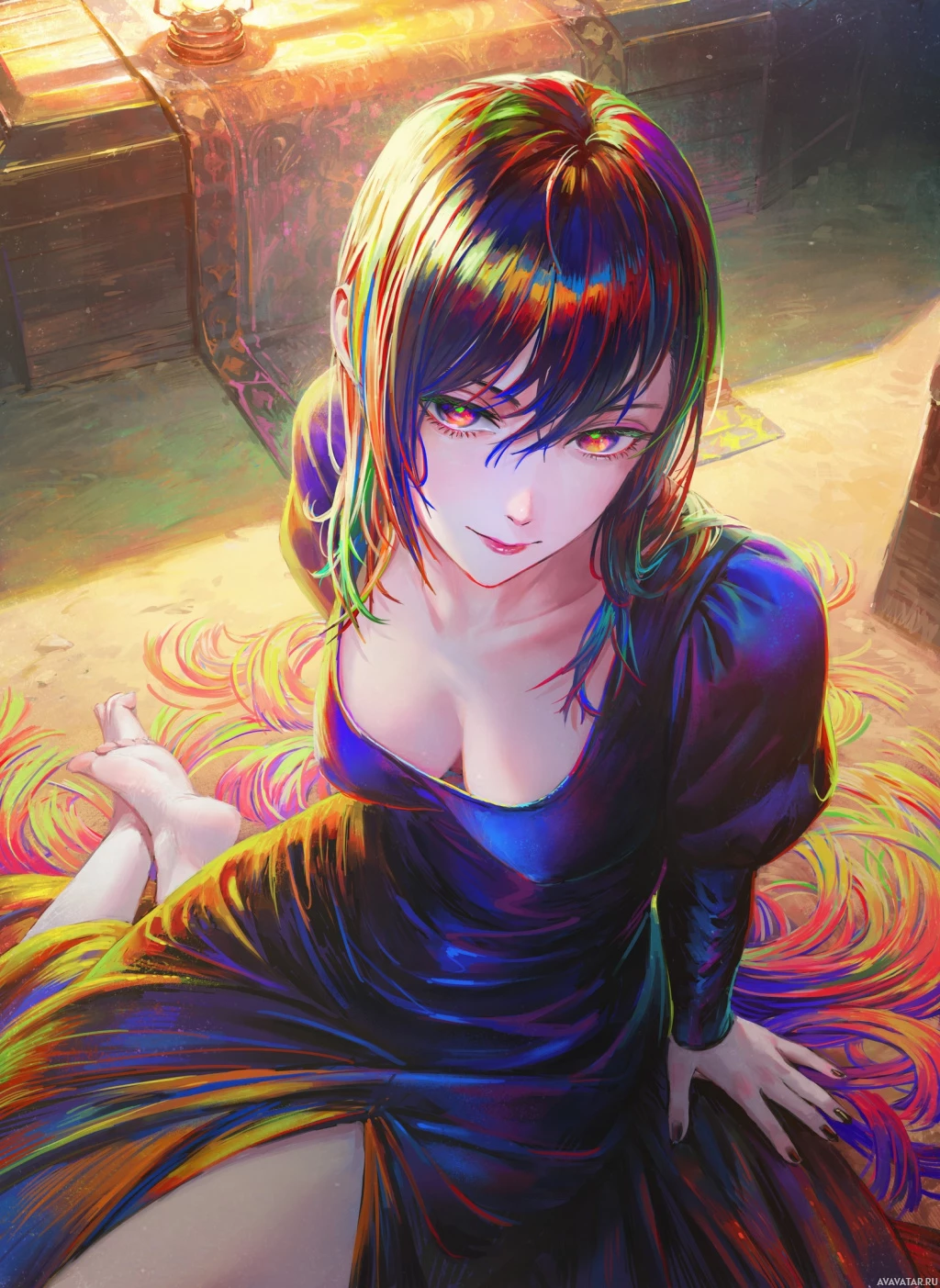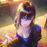a black dress and has an expression that could be described as "evil" or "mischievous." The background suggests she might be in a fantasy or
