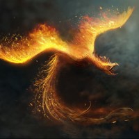 fiery feathers and the flames that are part of its appearance, symbolizing rebirth or renewal. The background appears to be dark with smoke or clouds, creating