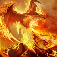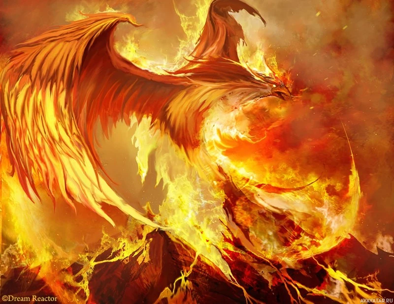 a fantastical creature, commonly known as a phoenix. It appears to be surrounded by flames and is portrayed in an intense and powerful stance, which aligns with the mythological representations of this bird-like being that is said to be reborn or resurrected from its