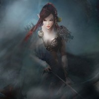 a defensive stance, suggesting she may be ready for combat or hunting. The background is foggy and mysterious, with dark figures that could be monsters or other creatures of