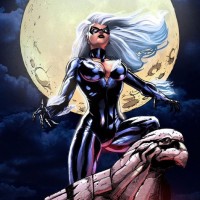 Black Cat. She is depicted in her iconic costume and is perched on a rocky outcropping with