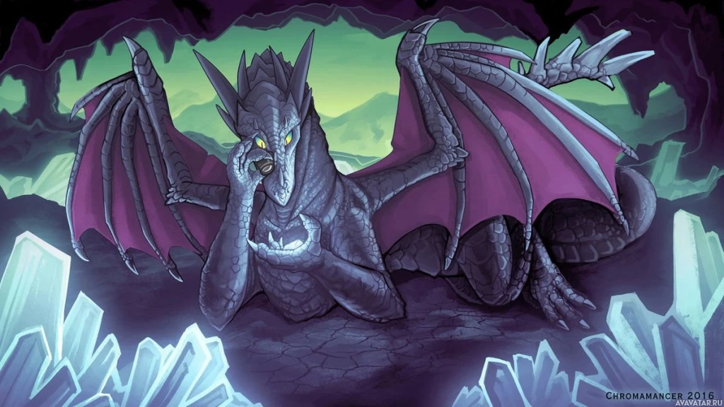 a cold environment. The dragon's posture is relaxed and it seems to be looking directly at the viewer. This creature is stylized in a way that suggests it might be a character from