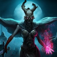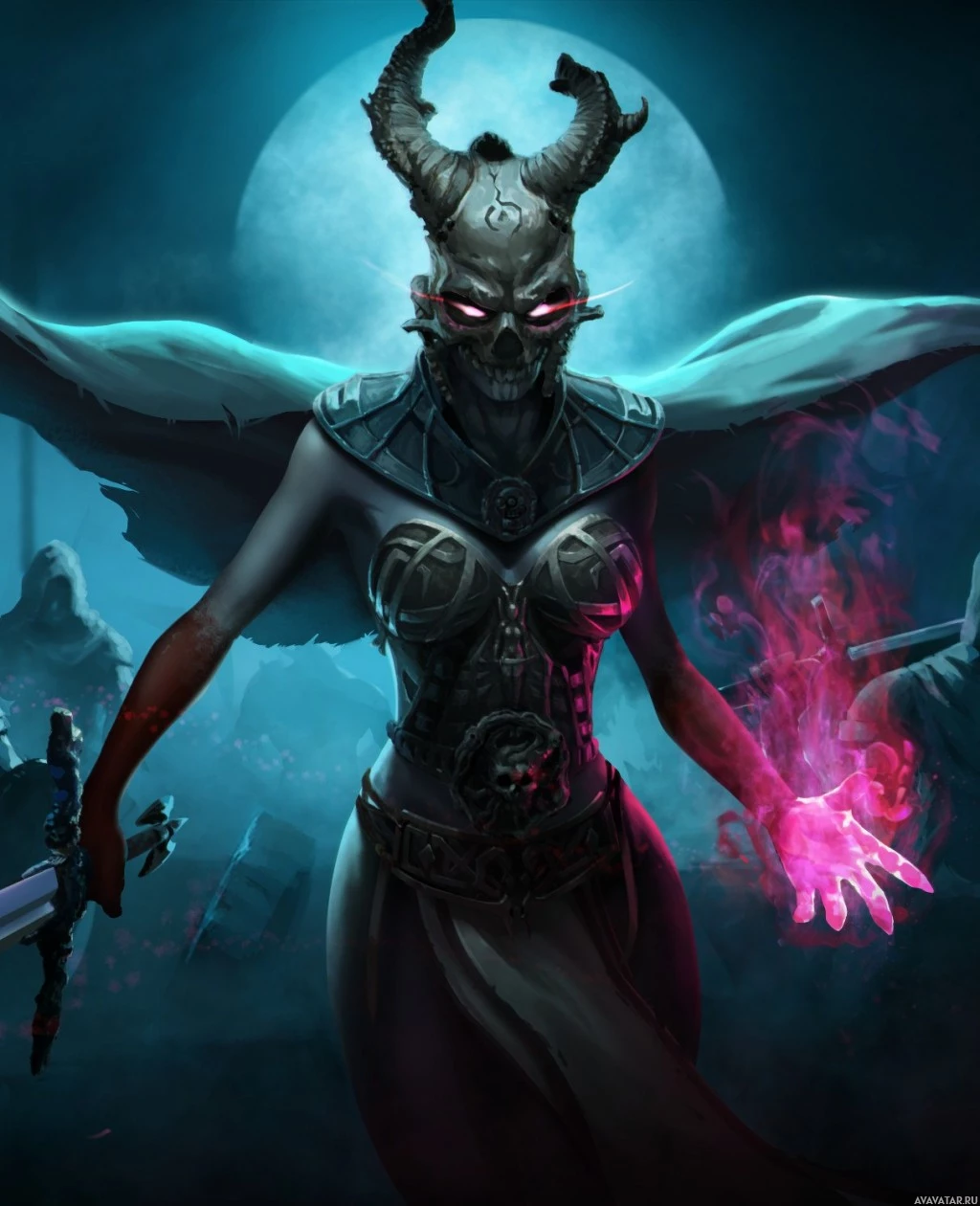 This is an image of a fantasy-themed illustration featuring a character who appears to be a sorceress or witch with horns. The character is wearing a cloak, and the background suggests