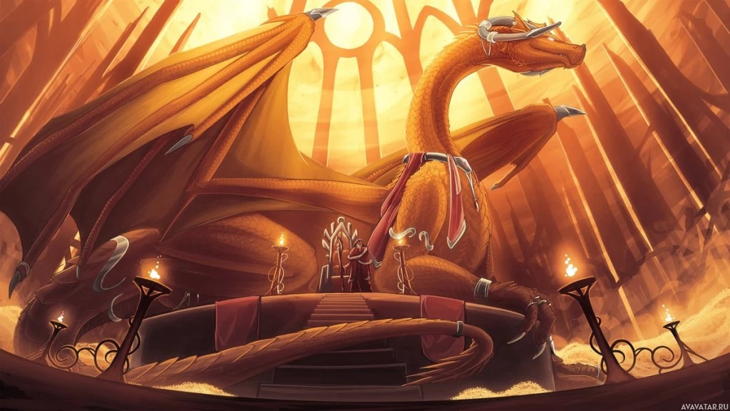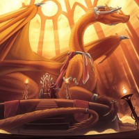 a fantastical scene featuring a dragon. The dragon is prominently positioned in the center, appearing to be on a throne with its wings spread wide. It's surrounded by a grand