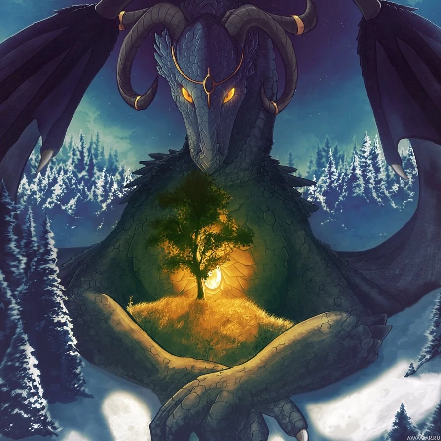 a state of relaxation. In the chest area of the dragon, there is a small green tree with foliage that glows brightly against