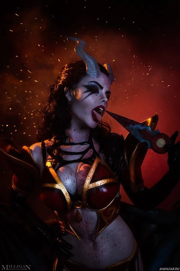 Queen of Pain from the game Dota 2. They are wearing elaborate makeup and costume, which include a corset with blood splatters, demonic horns on their head, and holding what appears to be a weapon that matches the character's