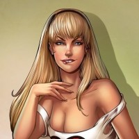 a casual top that has a graphic of what looks like a spider or similar creature on it. Her expression is relaxed but somewhat flirtatious, as she gazes directly at the viewer with a hint of a smile. The artwork suggests