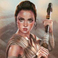 The image features a character known as Rey from the Star Wars franchise. She is depicted with a focused and determined expression, holding what appears to be a lightsaber in her right hand. Her attire resembles that of a Jedi or Sith warrior, suggesting she is part of the larger narrative involving these powerful forces within the universe of Star Wars.