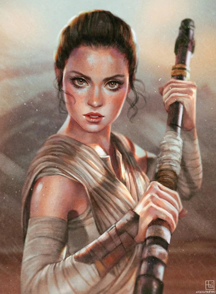 На картинке изображен персонаж, известный как Рей из франшизы «Звездные войны». Она изображена с сфокусированным и решительным выражением, держа в правой руке то, что кажется световым мечом. Ее одежда напоминает одежду воина-джедая или ситха, что говорит о том, что она является частью более широкого повествования, включающего эти мощные силы во вселенной Звездных войн.
