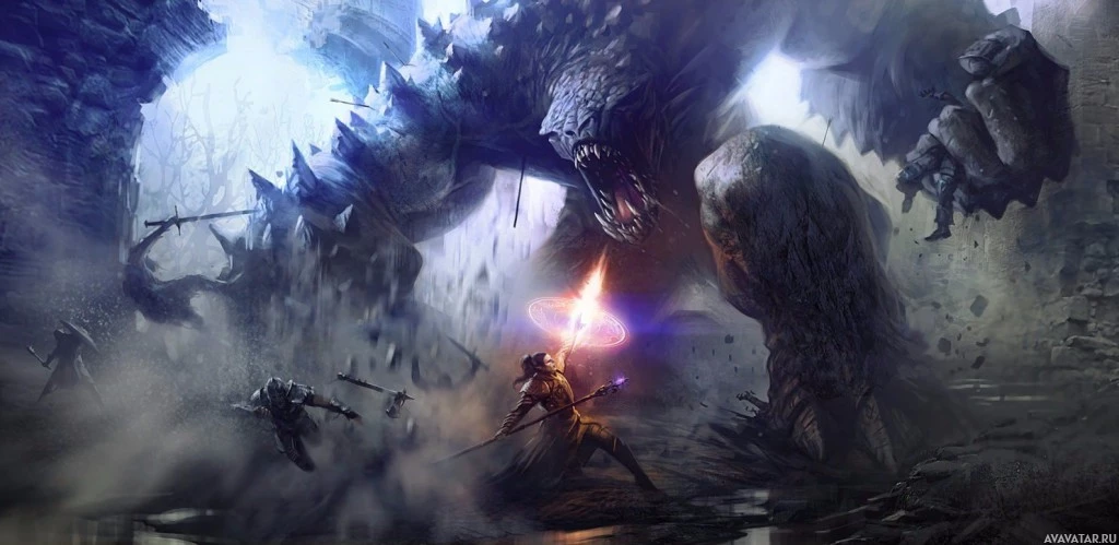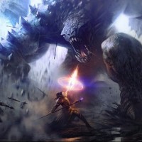 various weapons such as swords, bows, and shields, who appear ready to defend themselves or counter-attack against the monster. The setting appears to be outdoors in a rocky area with a misty background, suggesting an intense or dramatic moment within this