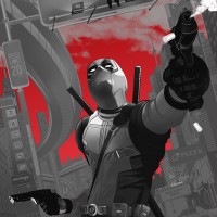 comic book anti-hero known for his unconventional actions and humorous demeanor. He is depicted with a gun in each hand, aiming them towards the viewer, which is