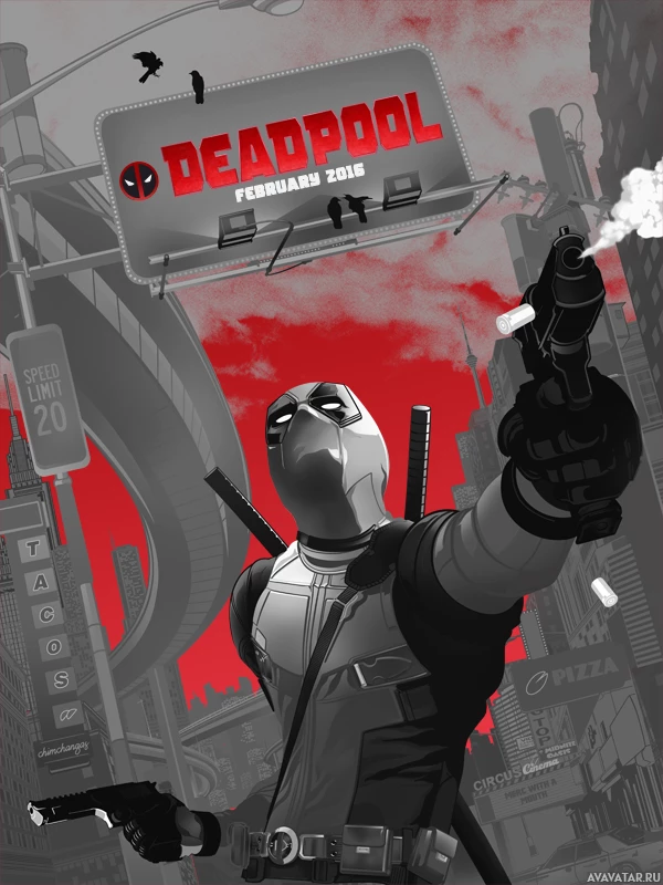 an urban setting that could be inspired by New York City, complete with a sign advertising "Deadpool" and indicating a date or event related to Deadpool's adventures.