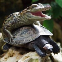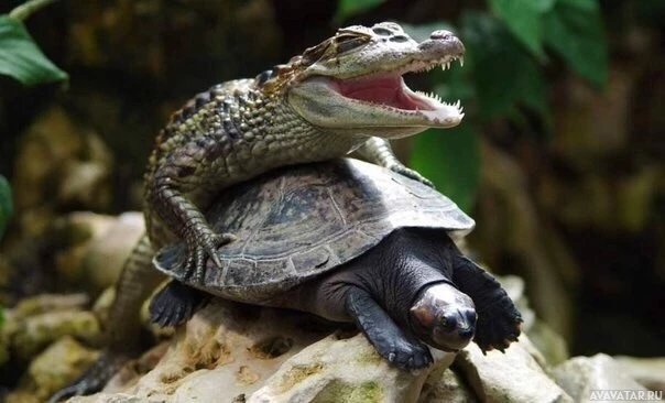 На снимке изображен крокодил на черепахе. Эта сцена необычна и не отражает естественное поведение этих животных, предполагая, что она может быть инсценирована или изменена для комедийного эффекта. Обстановка кажется естественной средой с камнями и растениями на заднем плане.
