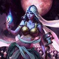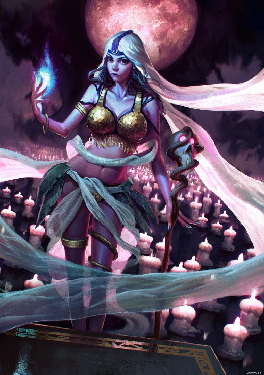 a full moon, and there are candles scattered around her, giving the impression of a mystical or magical setting. She has ethereal features, with a flowing dress and