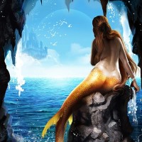 The image features a mermaid sitting on a rock near the entrance to what appears to be