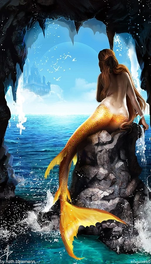 an underwater cave or grotto. She has long, flowing hair and is adorned with scales similar to those of fish. Her tail, which is yellowish-green in color, resembles that of a fish and seems to have scales as well. The setting suggests