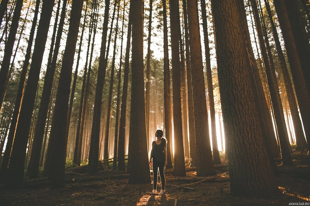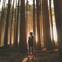 The image shows a person standing in the midst of a forest, with