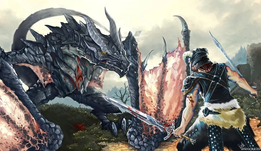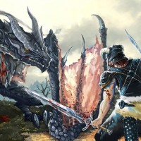 a human character on the left, armed with swords and wearing armor that seems to be of an elven style, suggesting they might be an elf or part of a storyline involving elves. On the right side of the image is a large dragon-like creature that could be interpreted as a dragon or