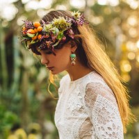 long hair and is wearing a lace dress with floral embellishments around the neckline. A wreath made of flowers and greenery adorns her head, adding a bohemian or nature-inspired touch to her attire. Her pose suggests she might be looking at something off-camera, and her expression is contemplative. The lighting casts a warm glow on the scene, enhancing