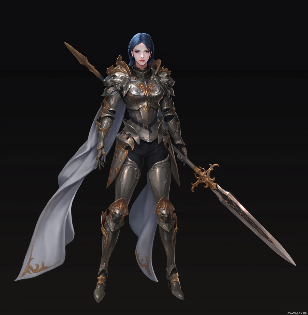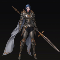 a long sword, while her right hand grasps a shield. A cape flows from her shoulders down to the ground. The character appears to be a digital illustration or artwork designed for a game or animation.