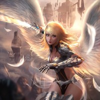 a female character, depicted as an angel in a fantasy setting. She is wearing armor and wielding a sword, suggesting she may be a warrior or defender. Her wings are spread wide, reinforcing her divine or mythical nature. In the background, there appears to be a chaotic