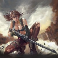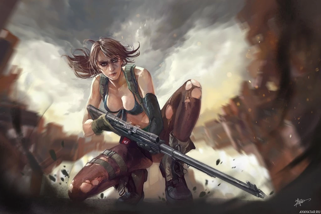 a sniper rifle in one hand, sitting on what looks like debris or rubble, possibly indicating that she has been involved in combat. Her attire includes camouflage clothing, boots, and gloves, which are typical of her
