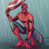 a dynamic pose, appearing to be swinging or running through the rain with his iconic spider web emanating from behind him. He's holding a shield, which resembles