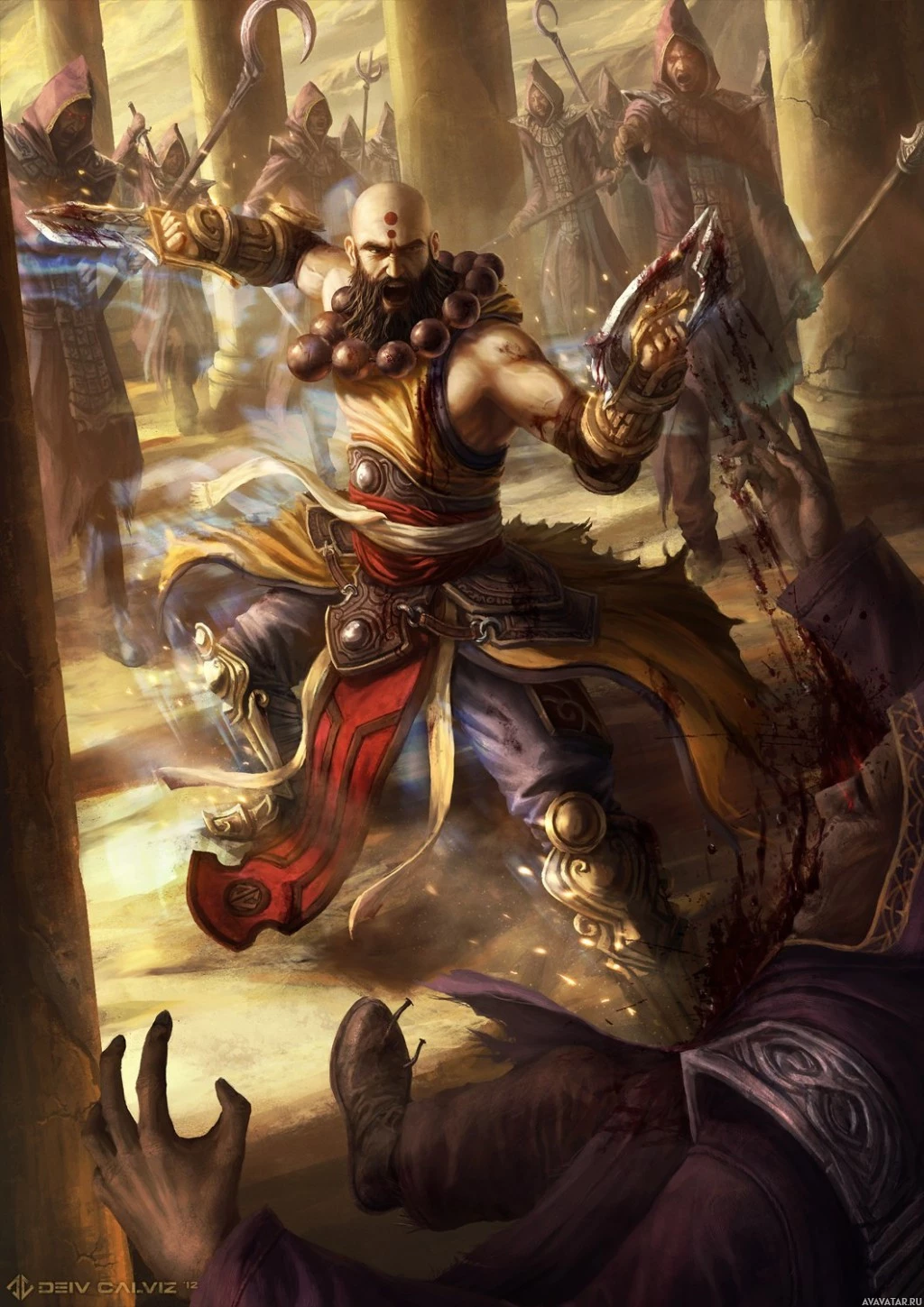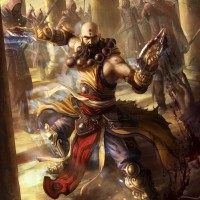 an animated character, reminiscent of characters from the Diablo game series. The character appears to be a warrior or monk-like figure with