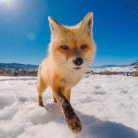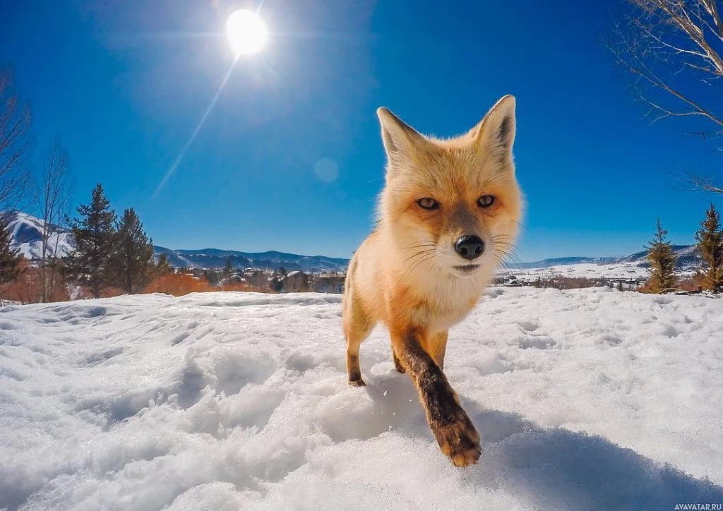 На снимке изображена рыжая лисица (Vulpes vulpes), идущая по заснеженной земле. Судя по наличию снега и деревьев, она находится в альпийском или гористом регионе. Ярко светит солнце, отбрасывая тени на снег, что указывает на то, что сейчас, возможно, полдень.