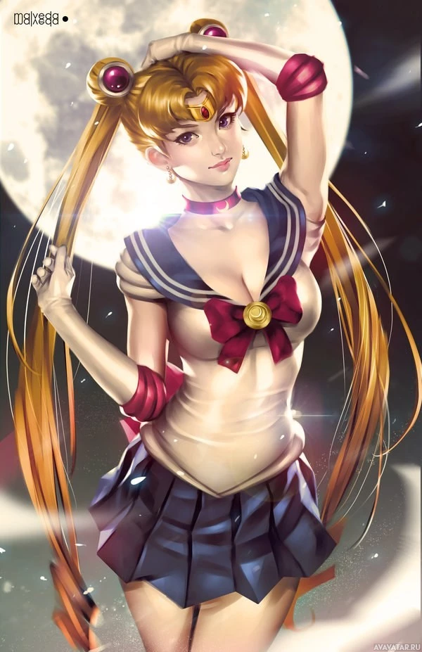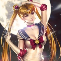 an illustrated character resembling Sailor Moon, a popular anime and manga series. She is standing against a night