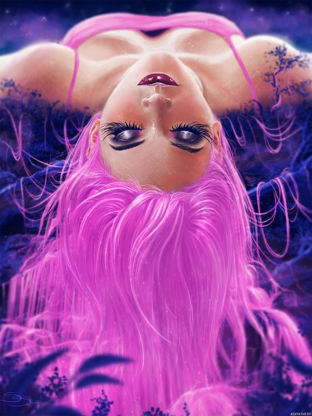 dark makeup around her eyes and appears to be in a serene or possibly dreaming state. Her hair is styled in a way that it cascades downward, creating