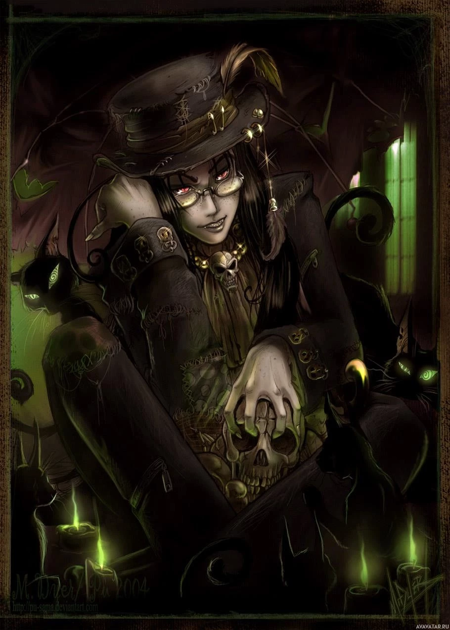 skulls in the background, which might symbolize death or the undead nature of this character. The style of the artwork is reminiscent of comic book illustrations with a dark fantasy theme.