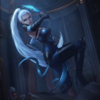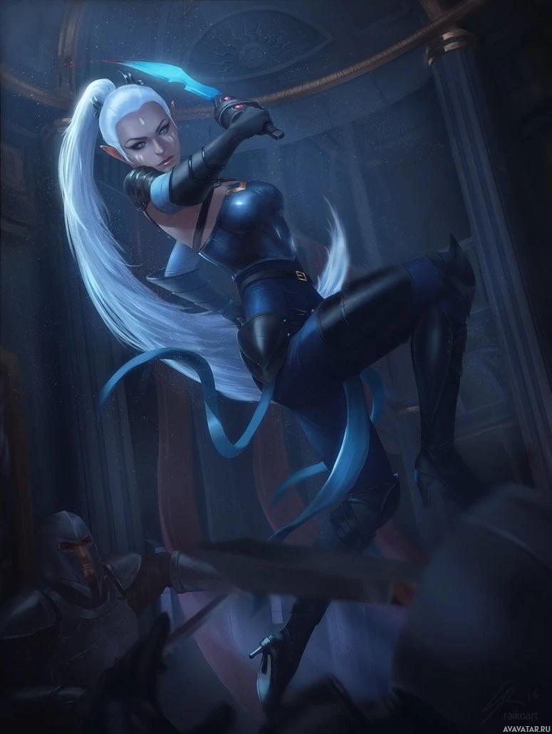 a fantasy game or story involving combat or adventure. The character is often associated with drow culture due to her features and attire, although it's important to note that "drow" typically refers to a fictional race of dark elves in the Dungeons & Dragons (D&D) role-