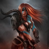 red hair, depicted in an action pose. She is wearing armor and wielding weapons that appear to be a sword and a shield or buckler. Her expression suggests determination and readiness for battle. The background has