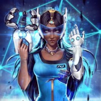 geometric pattern, possibly indicating some form of energy or technological interface. The overall aesthetic suggests that she could be a character from