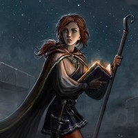 a young woman with red hair. She is dressed in a medieval style outfit, wearing a cloak and holding a book that appears to be open. In her other hand, she holds a staff or wand which could be used for magic or navigation. The setting is dark and seems to be at night, possibly indicating