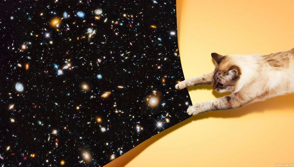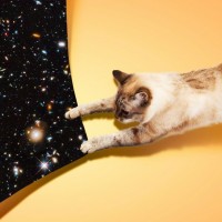 yellow background that contrasts with the image of space behind it, creating a humorous and imaginative scenario where the cat is interacting with the galaxy. The image has a creative and whimsical feel to it, blending the everyday sight of a cat with