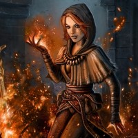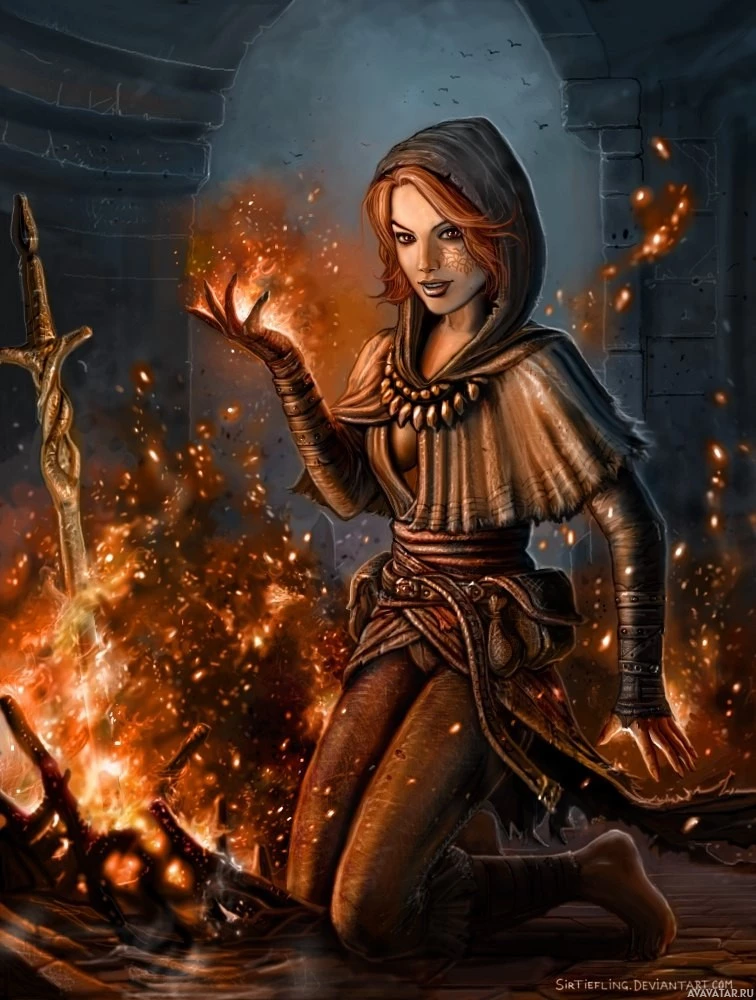 magical ritual. Behind her are flames that could be interpreted as fire, adding to the fantastical theme of the illustration.