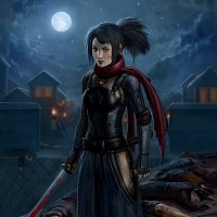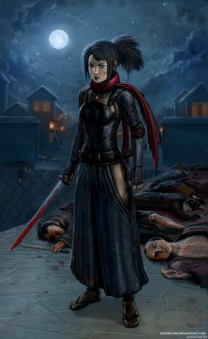 a black outfit with red accents and has a sword sheath strapped to her thigh. Behind her, it seems like a scene from